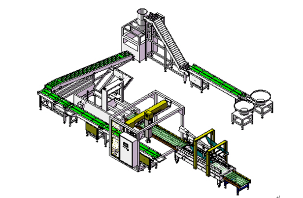 生产线设备组成:提升皮带输送线,自动整理排气,皮带输送线,在线称重剔除机,产品二维码扫描机构,开箱机,滚筒输送线,空箱定位机构,封箱机,自动整理整平机构,二维码贴标机,纸箱二维码扫描机构,自动装箱机,软件系统,整线控制。